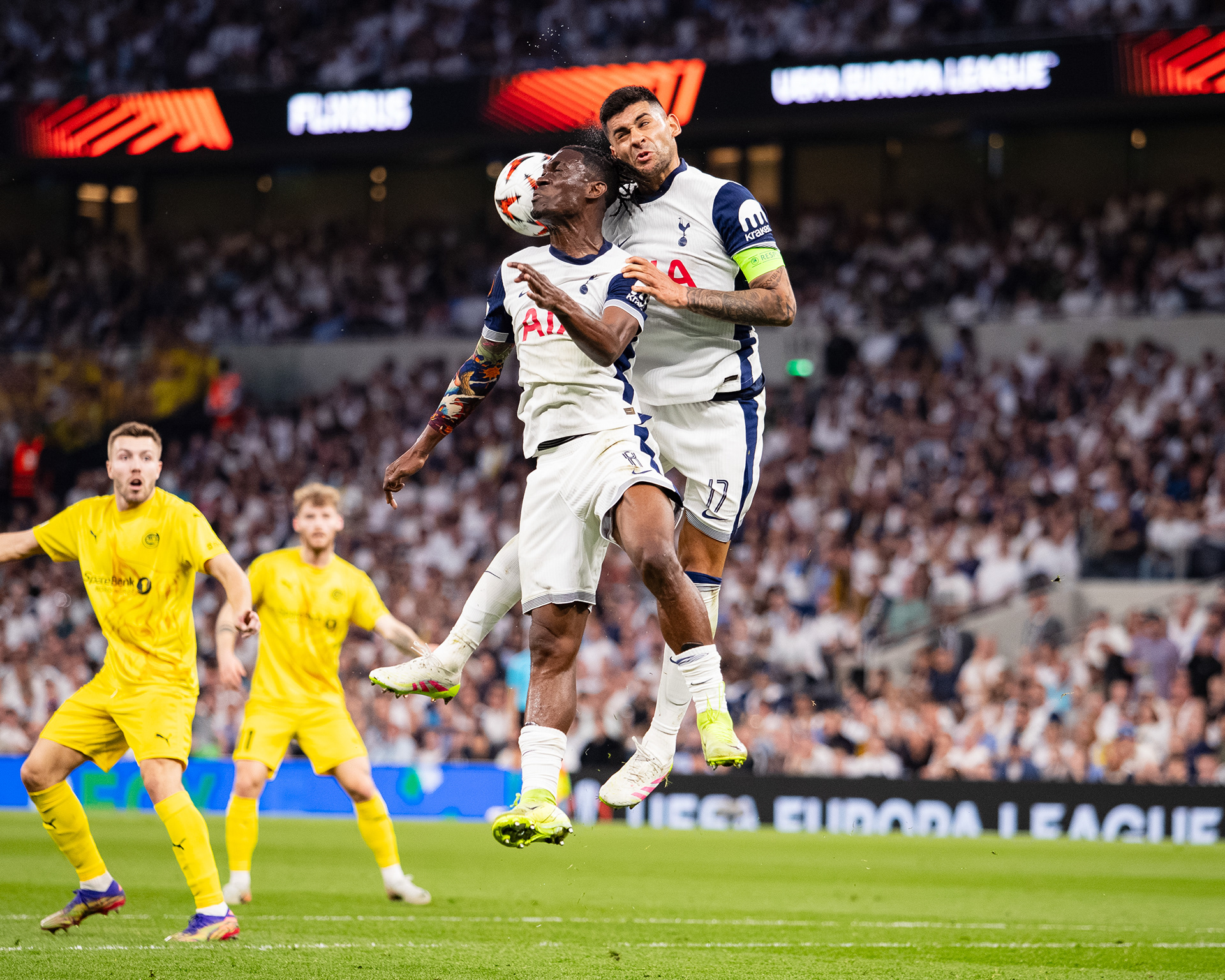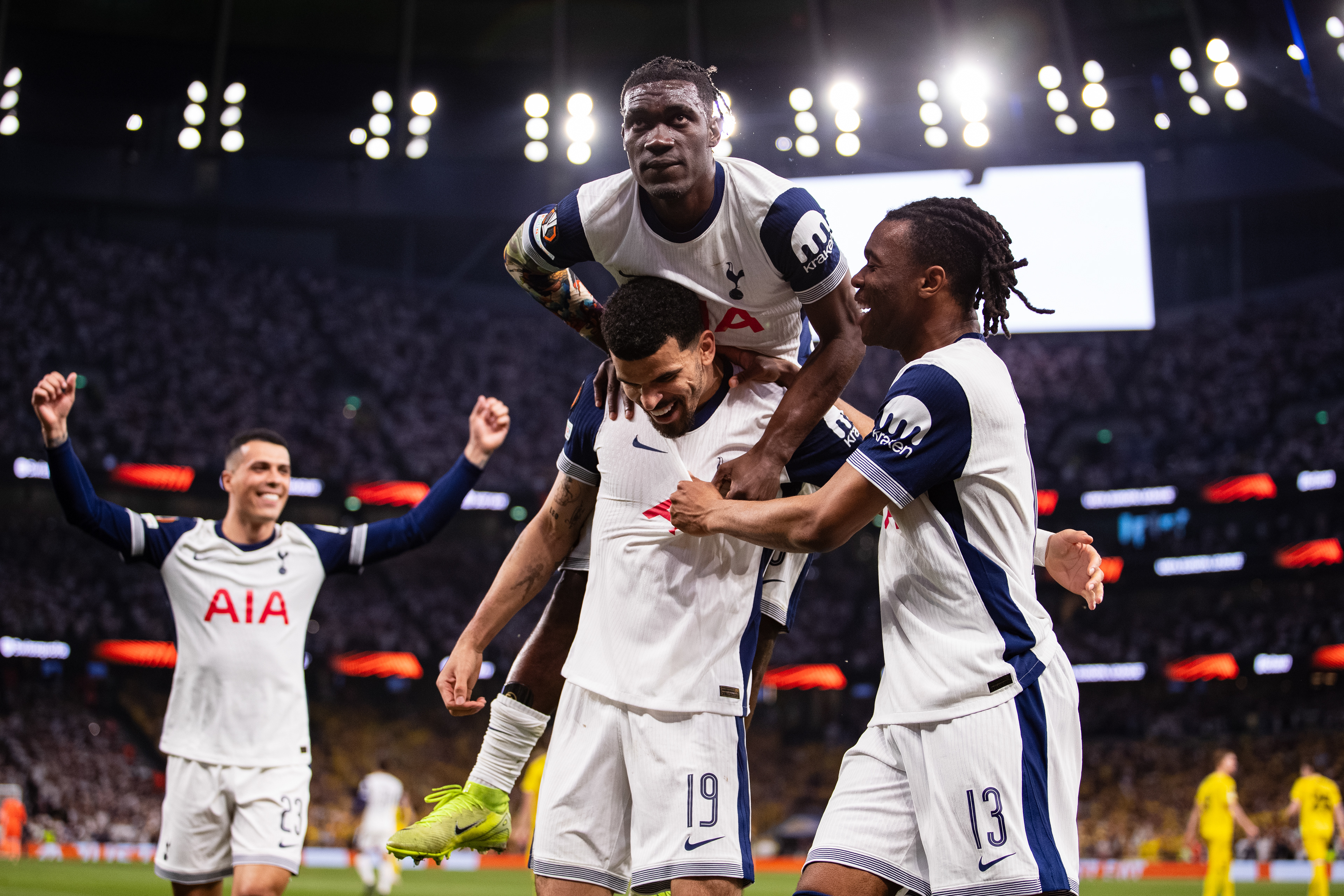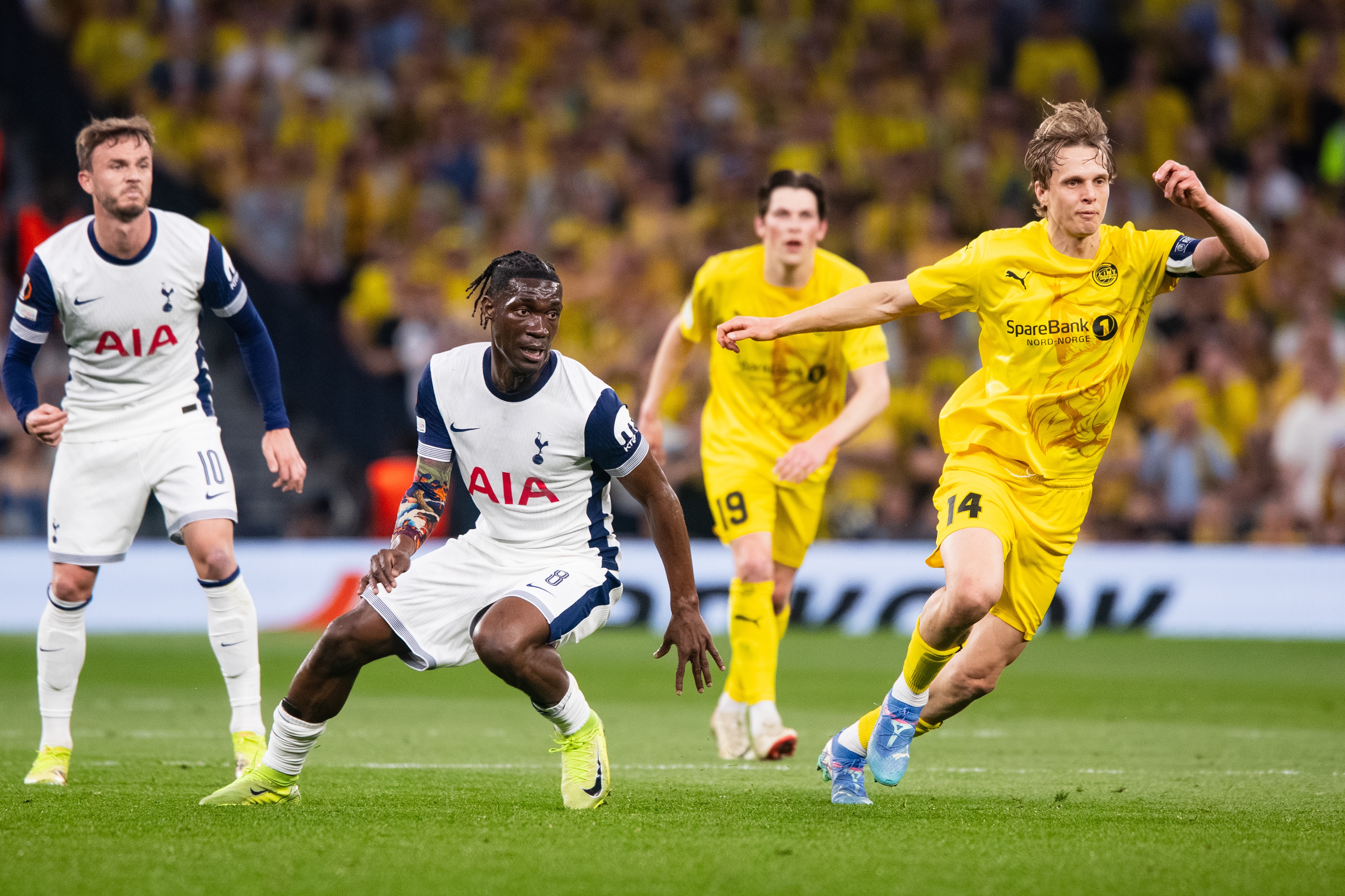 Spurs beat Bodø/Glimt 3-1 at home in the first leg of the 2024-25 Europa League semi-final. Brennan Johnson scored after just 39 seconds, James Maddison added a second in the 34th minute, and Dominic Solanke converted a penalty in the 61st. Bodø/Glimt pulled one back late through Ulrik Saltnes in the 83rd minute, but Spurs took a strong lead into the second leg.